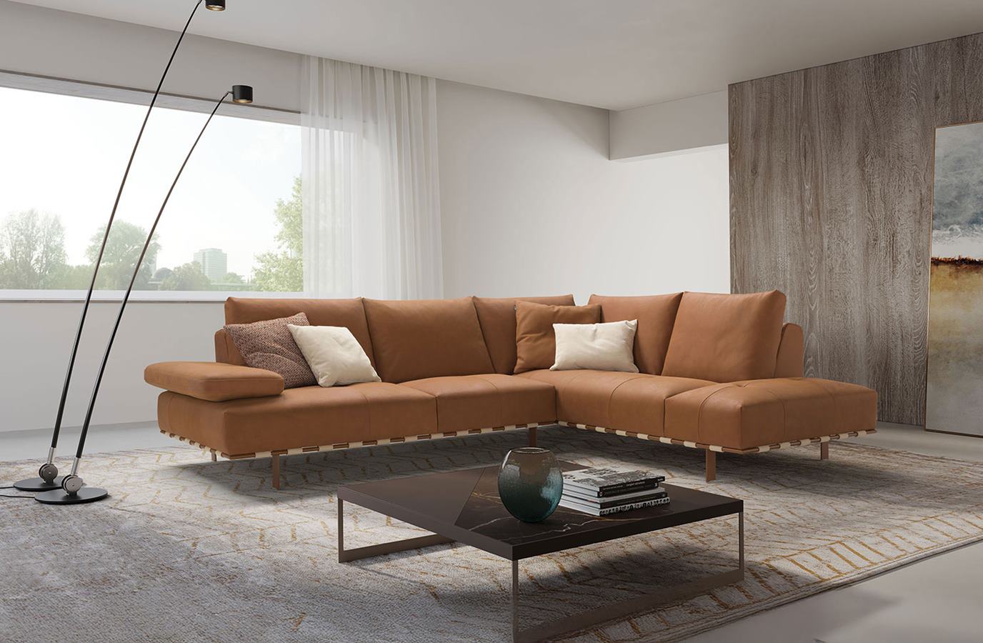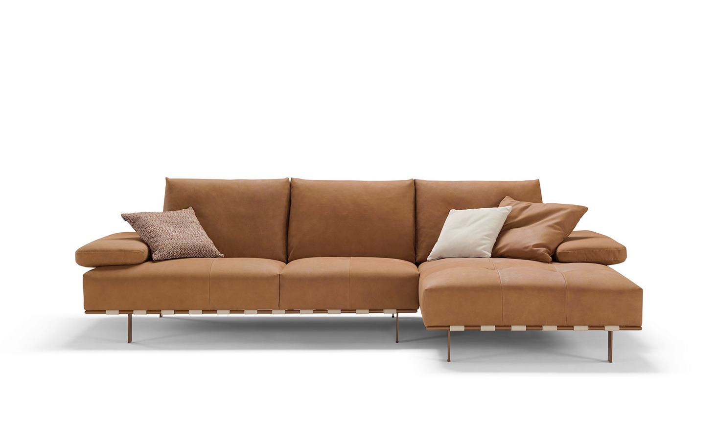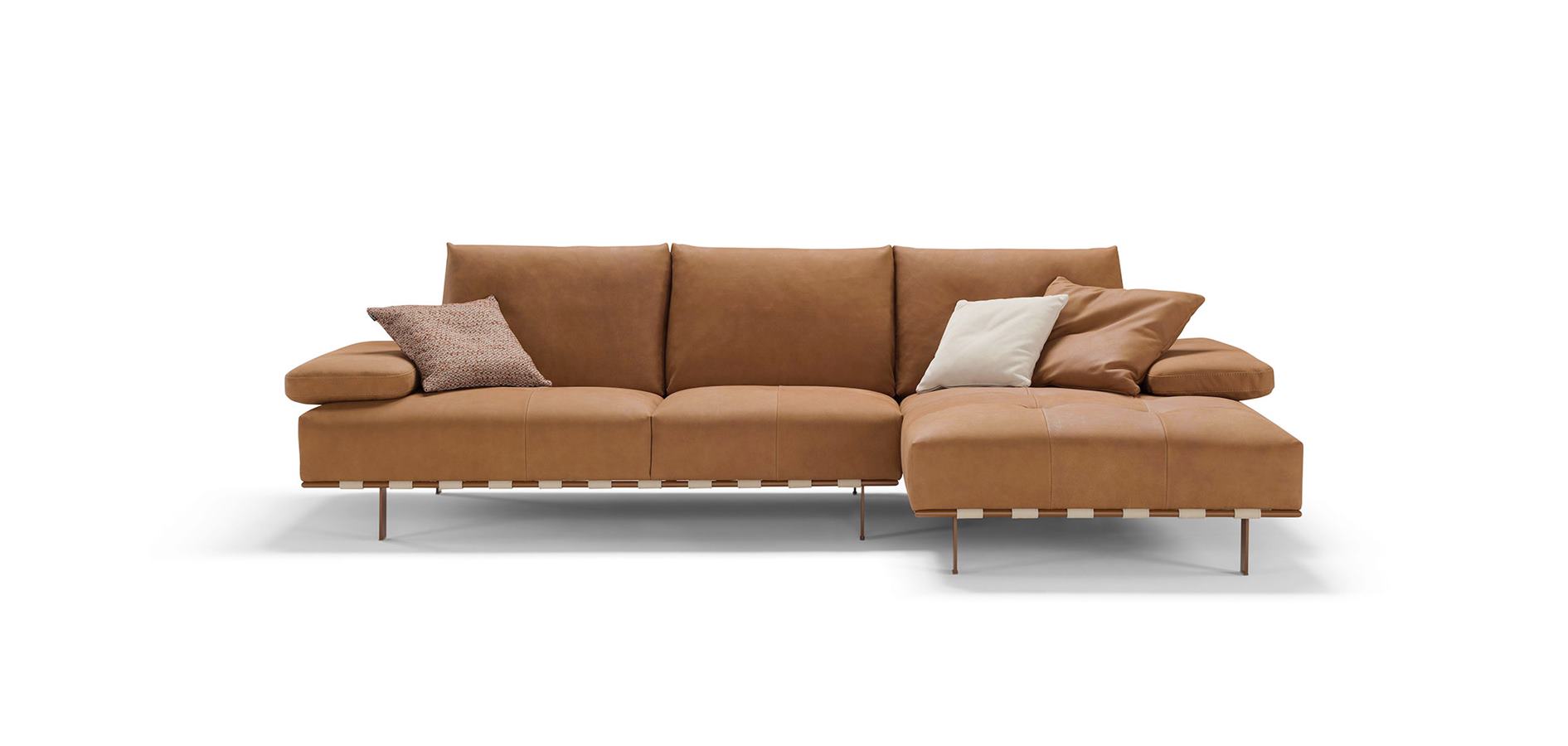 Sedací soupravu lze vyskládat do různých rozměrových sestav. V nabídce je kožené i textilní provedení.