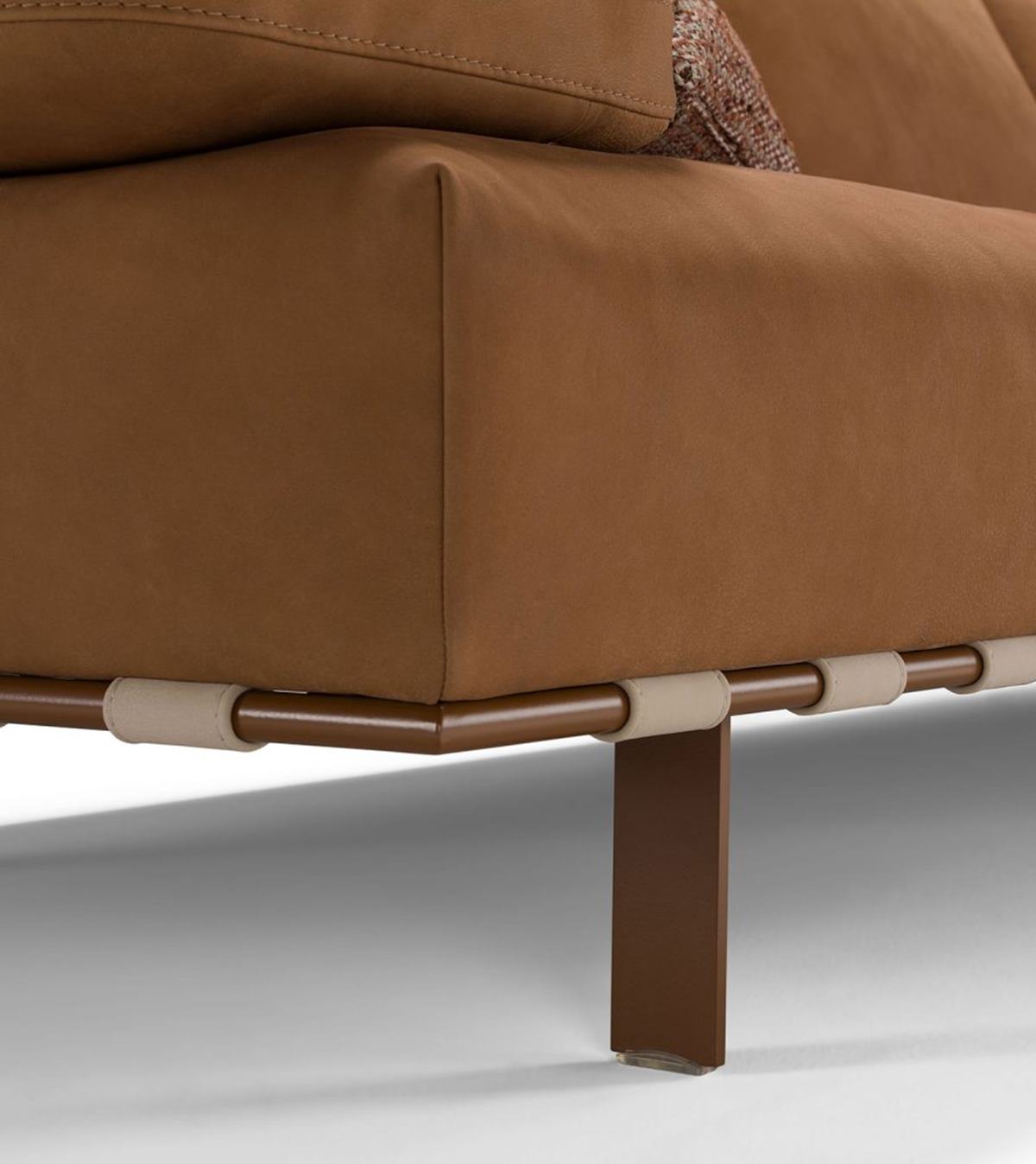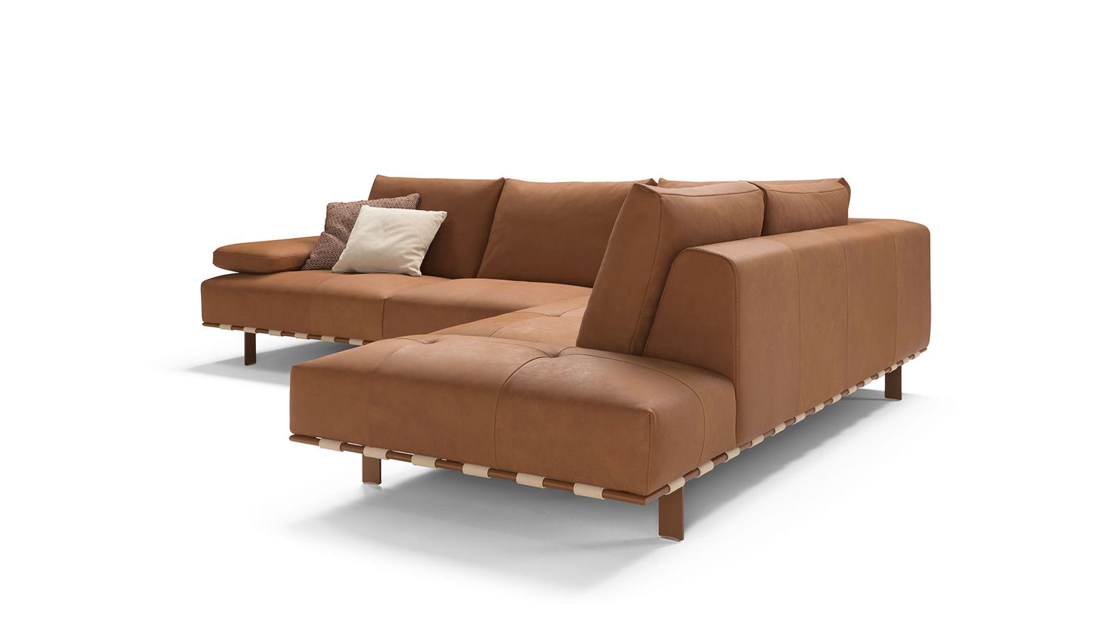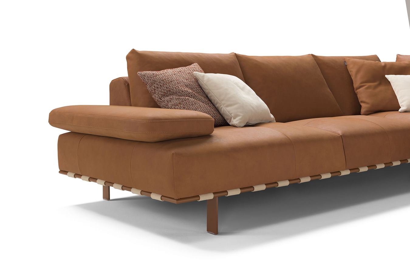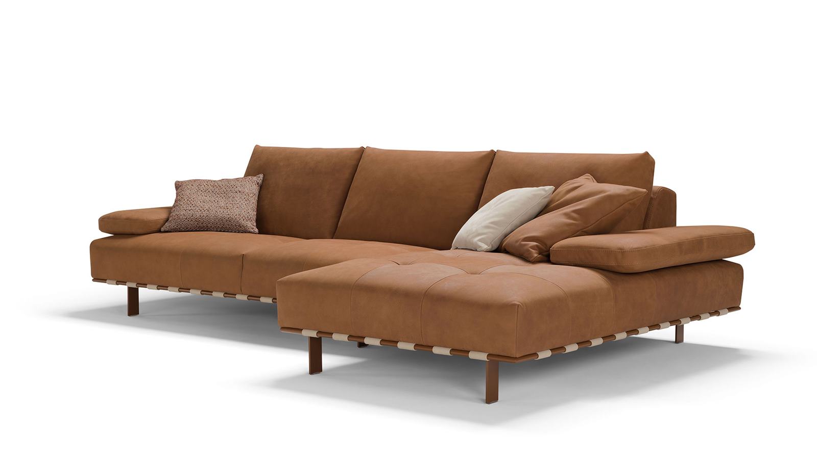 Sedací soupravu lze vyskládat do různých rozměrových sestav. V nabídce je kožené i textilní provedení.