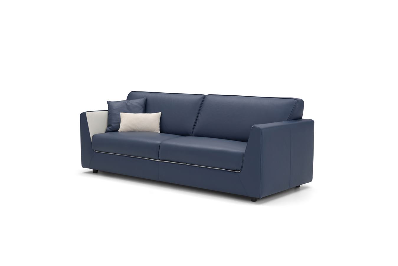 Sedací souprava kubického tvaru se zajímavě řešenou područkou. Komfort je měkký, jak jsme u modelů tohoto výrobce zviklí.