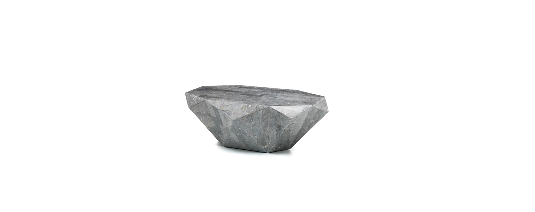 Konferenční stolek Diamond je svým složením jedinečný. Stolek je vyroben z fosílie - zkameněliny. speciální technologií. Kostra je vyrobena z tzv. Marine plywood (námořní překližka) a pryskyřice. Je to kvalitní překližka z tvrdého dřeva vyrobená s voděodolným lepidlem, ale není chemicky ošetřena. Je lehká, velmi pevná a prakticky bez defektů. Díky těmto vlastnostem je tento materiál oblíbenou volbou pro stavbu lodí a částí lodí. Je to také inteligentní volba pro projekty odolného exteriérového a interiérového nábytku v pobřežních oblastech, zejména poté, co získá silný ochranný povrch. Na takto vyrobenou kostru se lepí fosilní kámen, nařezaný na tenké pláty. Tímto procesem vznikají velmi zajímavé produkty s nezaměnitelným povrchem a celkovým vzhledem.