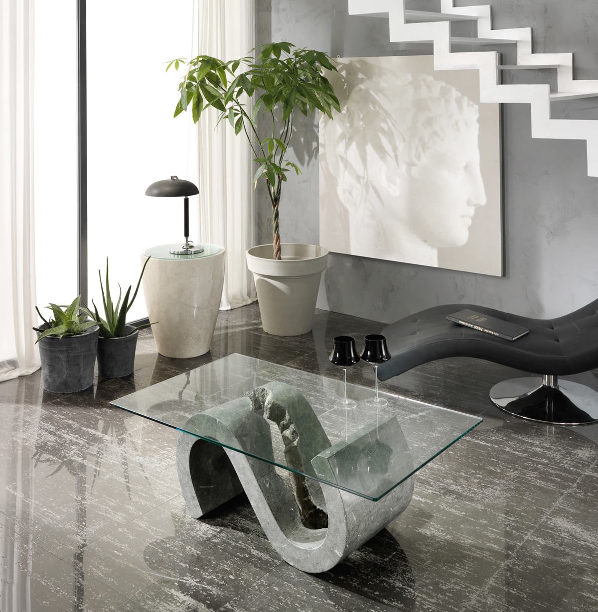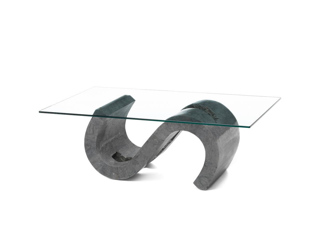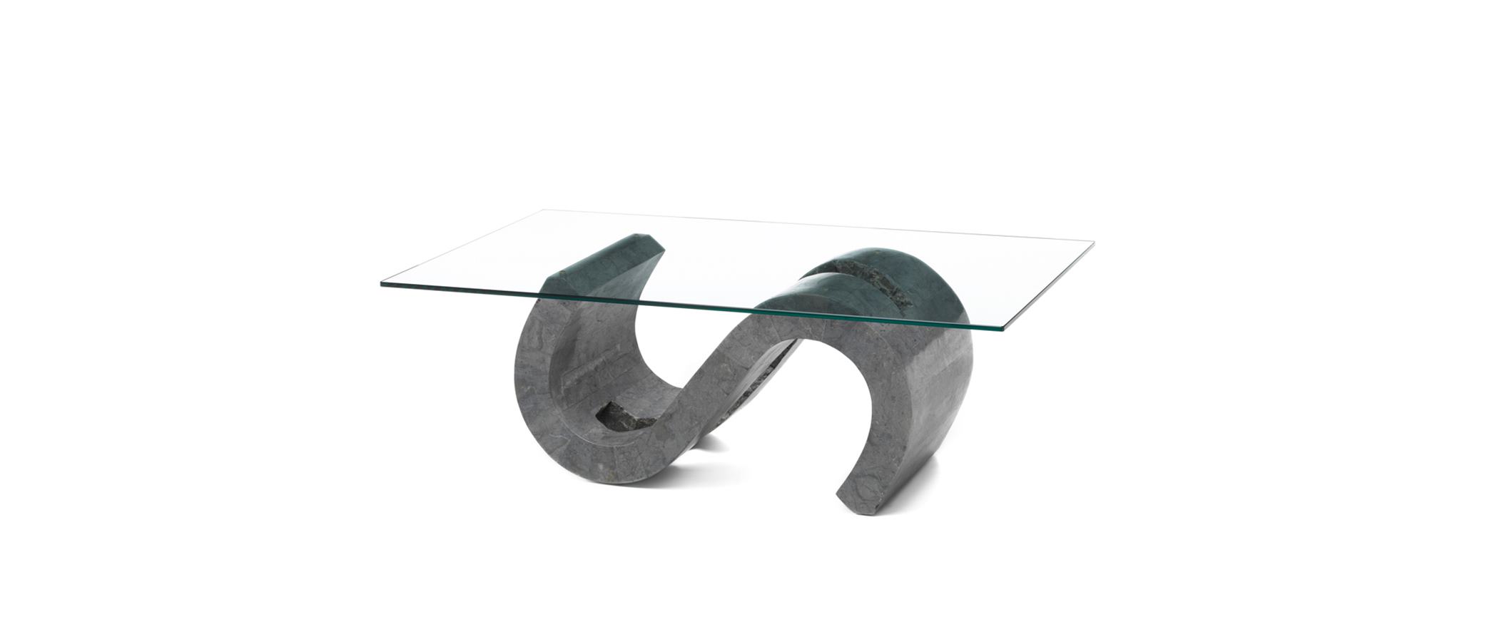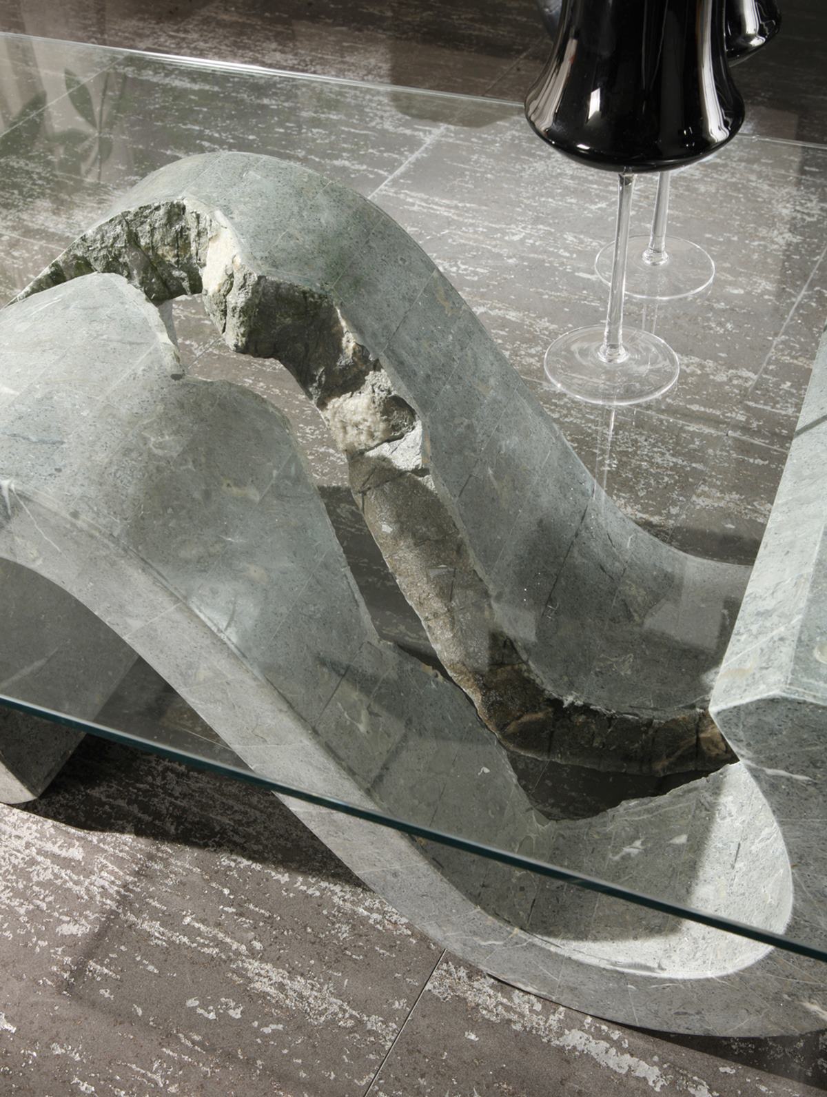 Konferenční stolek Flexus je svým složením jedinečný. V půdorysu má obdélníkový tvar a jako plát je vybaven čirým, bezpečnostním sklem o tloušťce až 1cm. Ozdobou stolku je samotná podnož, která je vyrobena z fosílie - zkameněliny. speciální technologií. Kostra podnože je vyrobena z tzv. Marine plywood (námořní překližka) a pryskyřice. Je to kvalitní překližka z tvrdého dřeva vyrobená s voděodolným lepidlem, ale není chemicky ošetřena. Je lehká, velmi pevná a prakticky bez defektů. Díky těmto vlastnostem je tento materiál oblíbenou volbou pro stavbu lodí a částí lodí. Je to také inteligentní volba pro projekty odolného exteriérového a interiérového nábytku v pobřežních oblastech, zejména poté, co získá silný ochranný povrch. Na takto vyrobenou kostru se lepí fosilní kámen, nařezaný na tenké pláty. Tímto procesem vznikají velmi zajímavé produkty s nezaměnitelným povrchem a celkovým vzhledem.