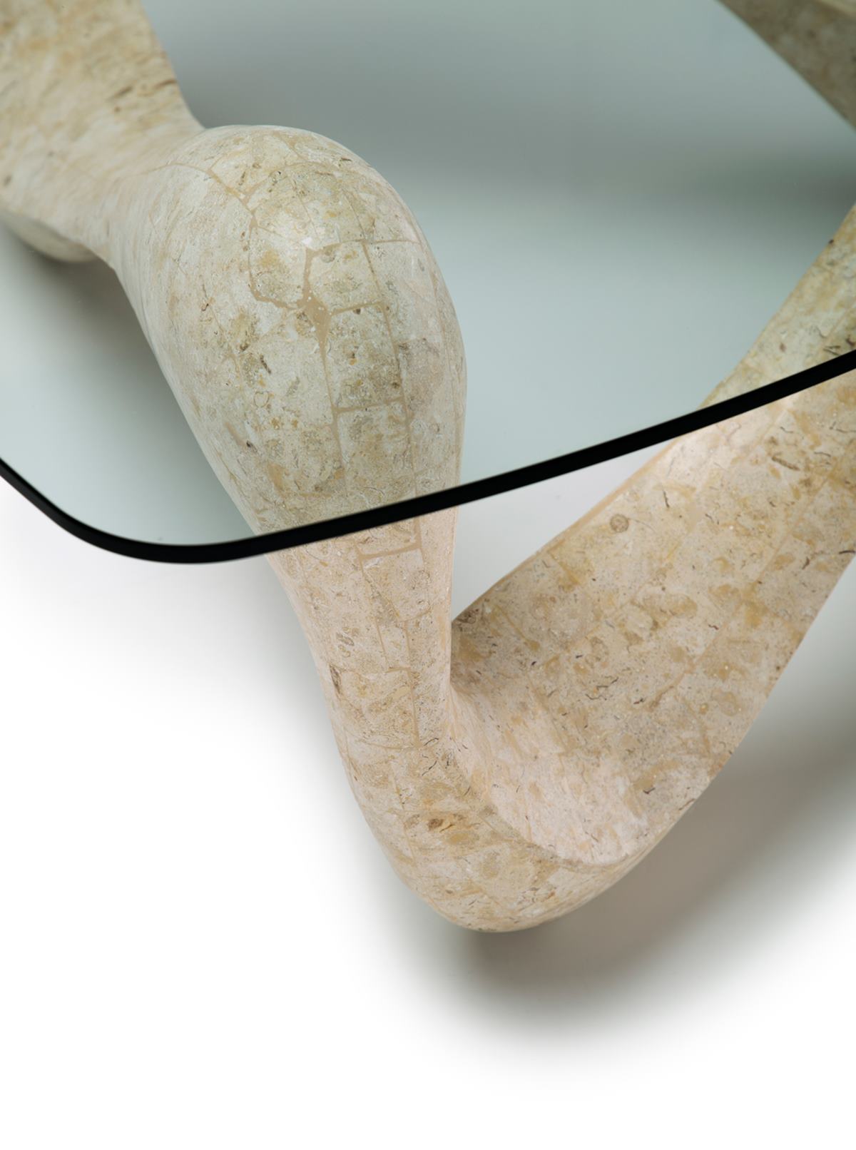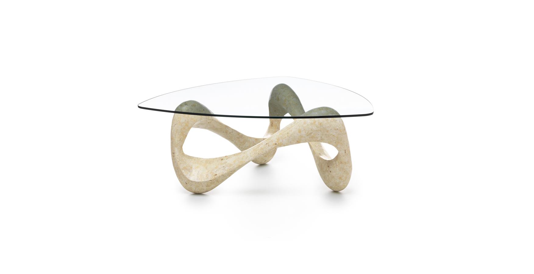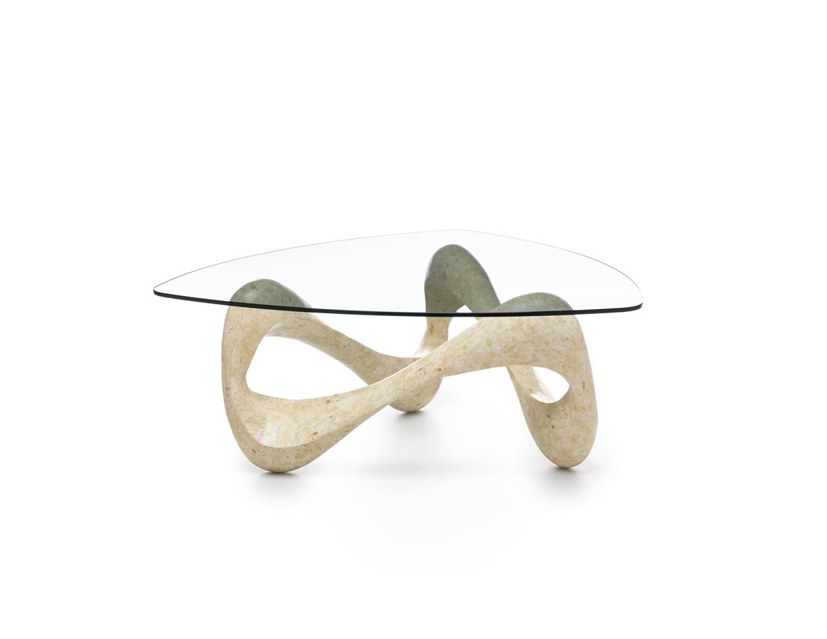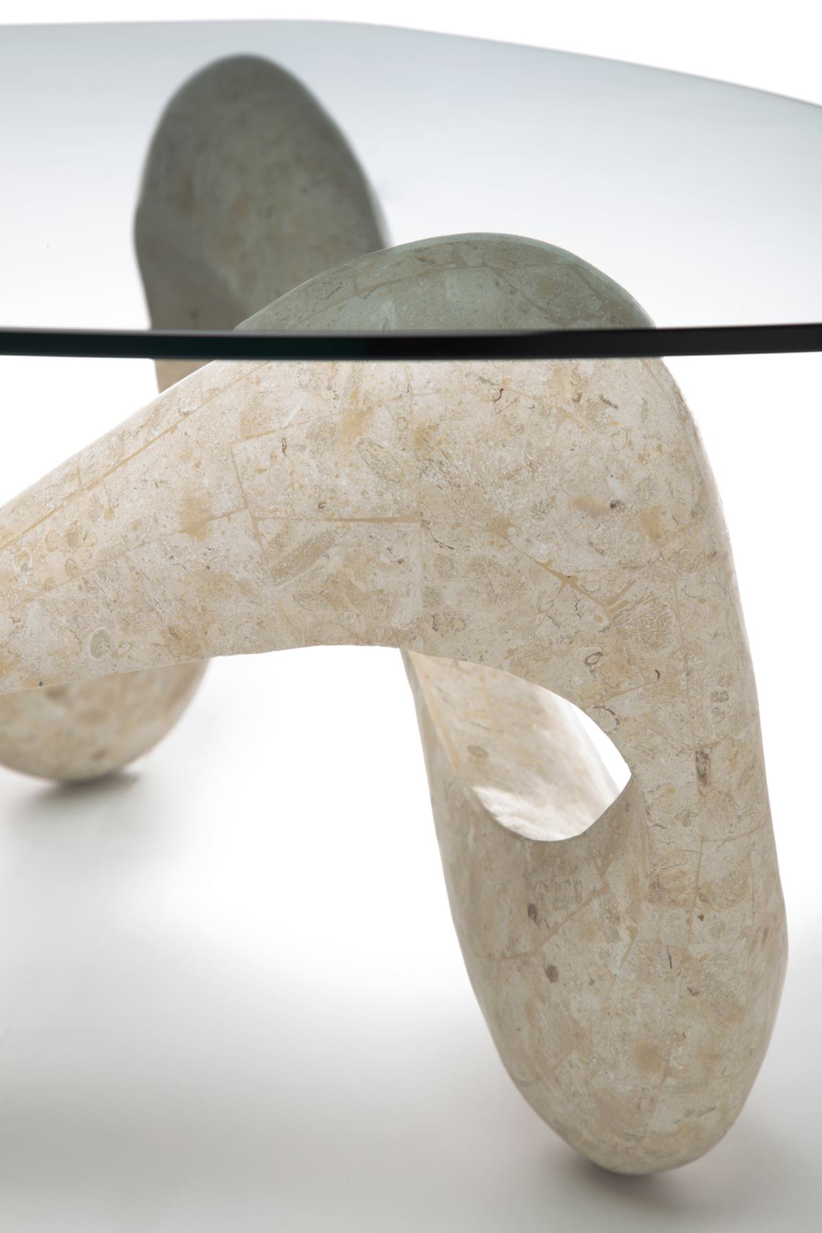 Konferenční stolek Tetris je svým složením jedinečný. V půdorysu má trojúhelníkový tvar a jako plát je vybaven čirým, bezpečnostním sklem. Ozdobou stolku je samotná podnož, která je vyrobena z fosílie - zkameněliny. speciální technologií. Kostra podnože je vyrobena z tzv. Marine plywood (námořní překližka). Je to kvalitní překližka z tvrdého dřeva vyrobená s voděodolným lepidlem, ale není chemicky ošetřena. Je lehká, velmi pevná a prakticky bez defektů. Díky těmto vlastnostem je tento materiál oblíbenou volbou pro stavbu lodí a částí lodí. Je to také inteligentní volba pro projekty odolného exteriérového a interiérového nábytku v pobřežních oblastech, zejména poté, co získá silný ochranný povrch. Na takto vyrobenou kostru se lepí fosilní kámen, nařezaný na tenké pláty. Tímto procesem vznikají velmi zajímavé produkty s nezaměnitelným povrchem a celkovým vzhledem.