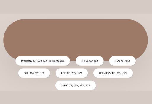 PANTONE 17-1230 Mocha Mousse je hřejivý, bohatý odstín hnědé. Osloví nás sugescí příjemných vlastností čokolády a kávy a vyjadřuje naši touhu po pohodlí. Sofistikovaná a svěží, ale zároveň klasická barva rozšiřuje naše představy o hnědých odstínech. Barva je také úzce spojena s přírodním světem a doufá, že inspiruje hlubší spojení s naším přírodním prostředím.
