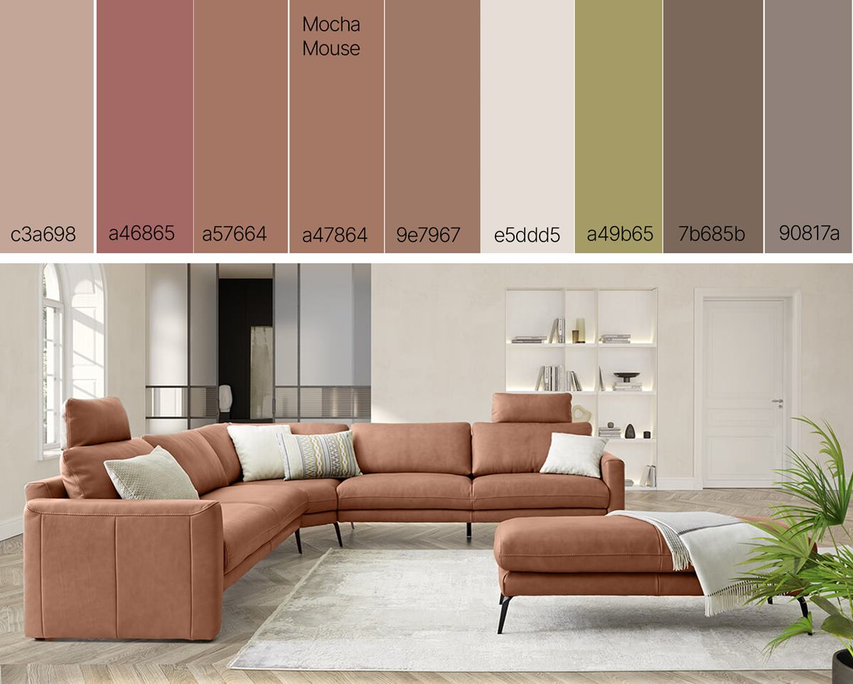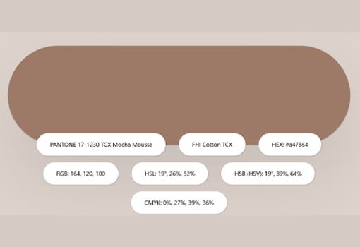 Hnědá se po dlouhých letech vrací do barevné palety interiérového designu. S lahodnou směsí čokolády a kávy můžeme umocnit pocit pohodlí v našich domovech. Tato charakteristika je typická pro všechny zemité tóny, ale útulný pocit platí zejména pro tento odstín Se svojí sofistikovanou, zemitou elegancí může Mocha Mousse stát samostatně nebo sloužit jako všestranný základ. Pro širokou škálu barevných palet a aplikací – od minimalistických barev až po detailní design – ve všech odvětvích zaměřených na barvy. PANTONE 17-1230 lze snadno integrovat do interiérového designu a zařízení, čímž uspokojí touhu po pohodlí a teple.