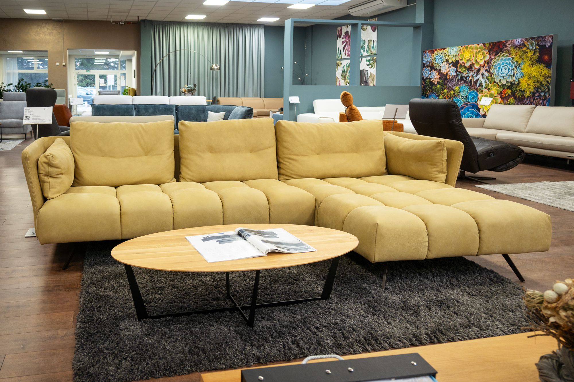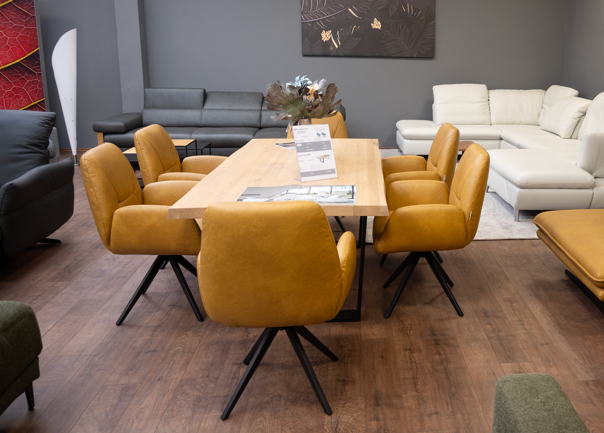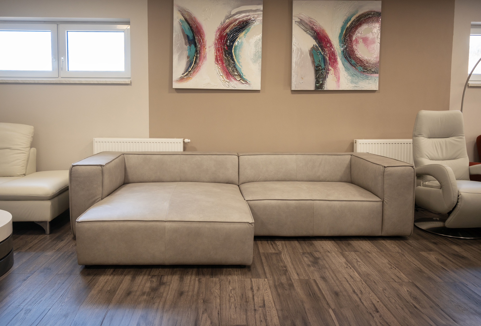 Sedací souprava slouží jako exponát na showroomu v Bratislavě. Nechybí komfortní prvky, jako nastavitelná hloubka sedáků, výškově nastavitelné opěrky hlavy, polohovatelné područky. Sedačka má rozklad ve stejném potahu a velký úložný prostor.